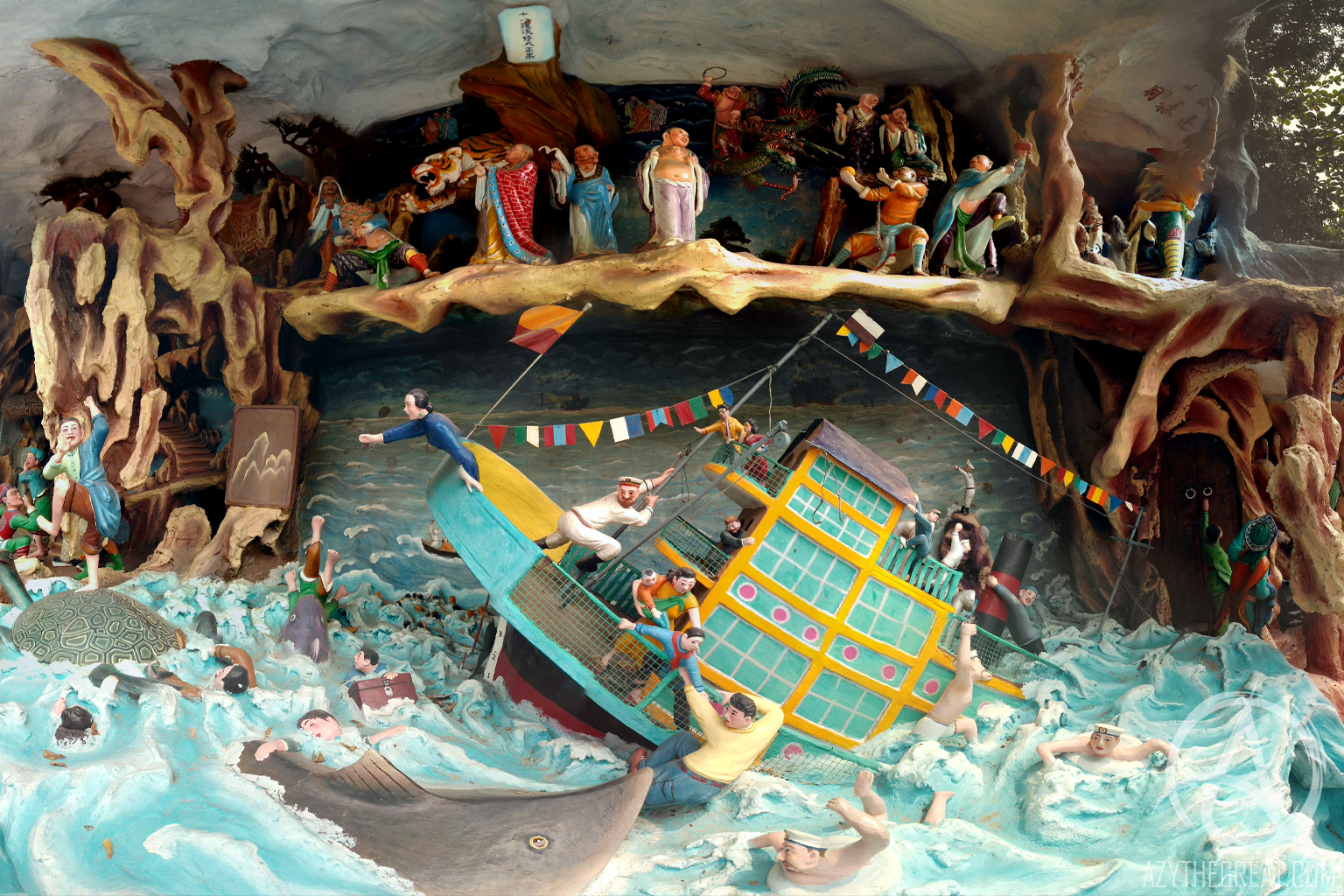The motif of fishermen being rescued by a giant shelled reptile can be found in other folk tales from Northeast Asia, such as the third-century Liùdù Jíjīng (六度集經, Sutra of the Six Perfections), which includes a story about a turtle saving a human, reflecting Buddhist teachings on compassion, sacrifice, and karmic return. A similar motif appears in the Japanese folktale Urashima Tarō. And finally, a panel at Haw Par Villa yet again depicts a turtle rescuing a man named Wang Qing. Given its similarity to other folktales, the giant shelled-reptile in the Kusu legend is likely a local adaptation rooted in Chinese folklore.